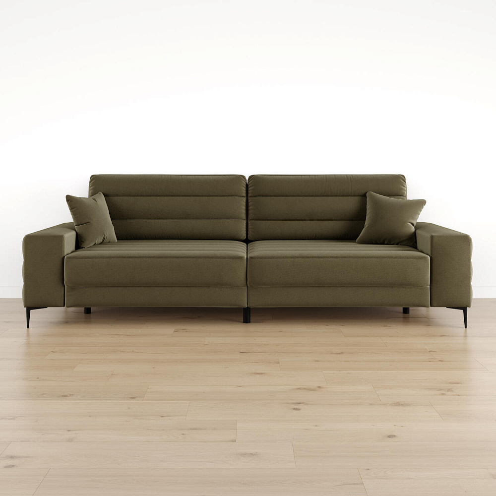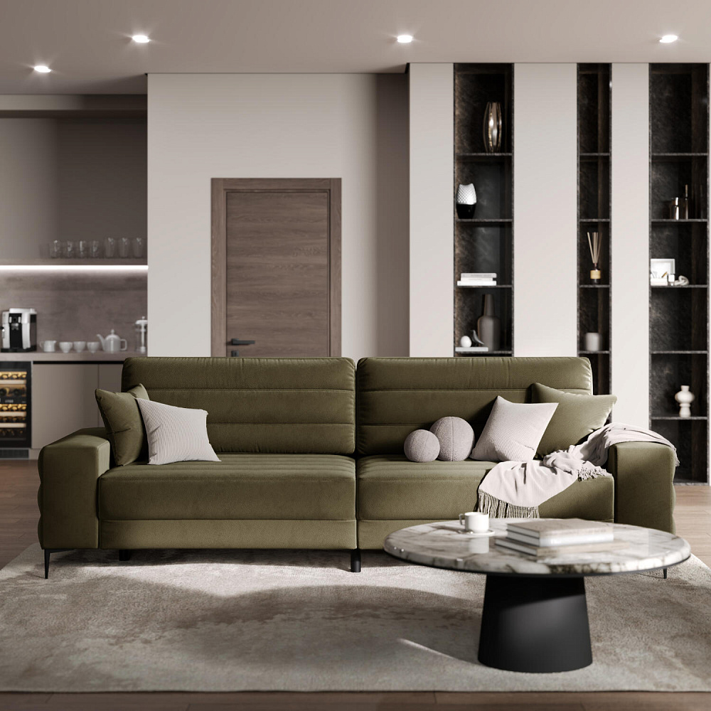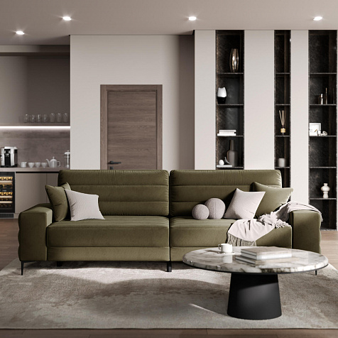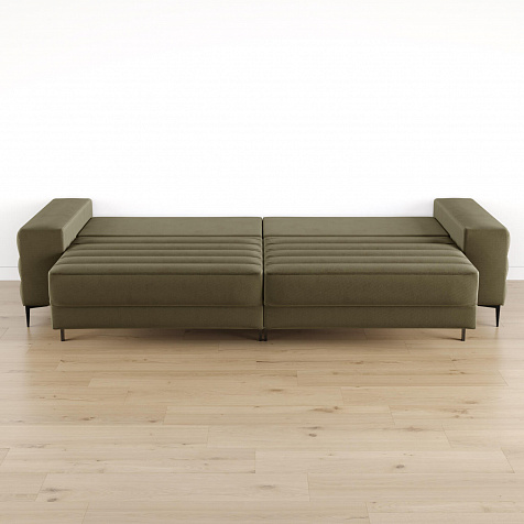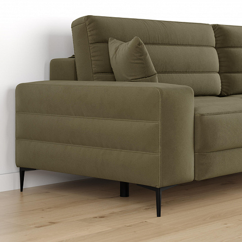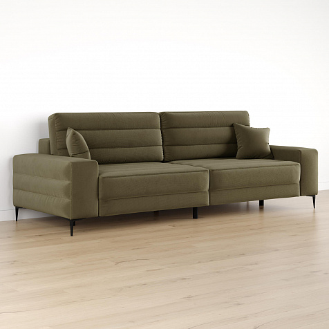 Диван «Лиам» создан для любых современных интерьеров, особенно в стиле минимализм или джапанди. Прямоугольные формы, горизонтальная строчка на каждом элементе дивана и тонкие черные опоры образуют элегантный образ. Простой в использовании механизм трансформации поможет быстро разложить диван и создать просторное спальное место. Также «Лиам» имеет вместительное место хранения под сиденьем для множества вещей.