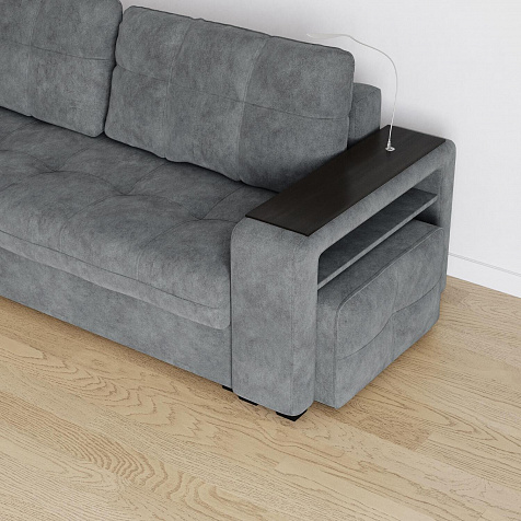 Полка в левом подлокотнике. На полке поместится пульт от телевизора, джойстики, зарядные устройства, небольшие книги и другая мелочь.