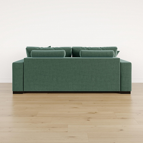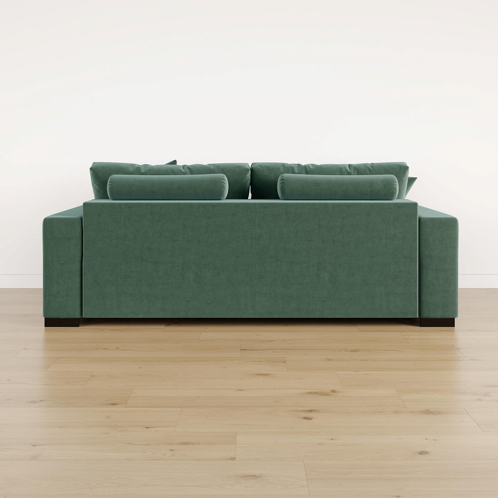 Обратная сторона спинки в обивочной ткани. Диван прекрасно подойдёт для зонирования помещений или расположения в центре комнаты.