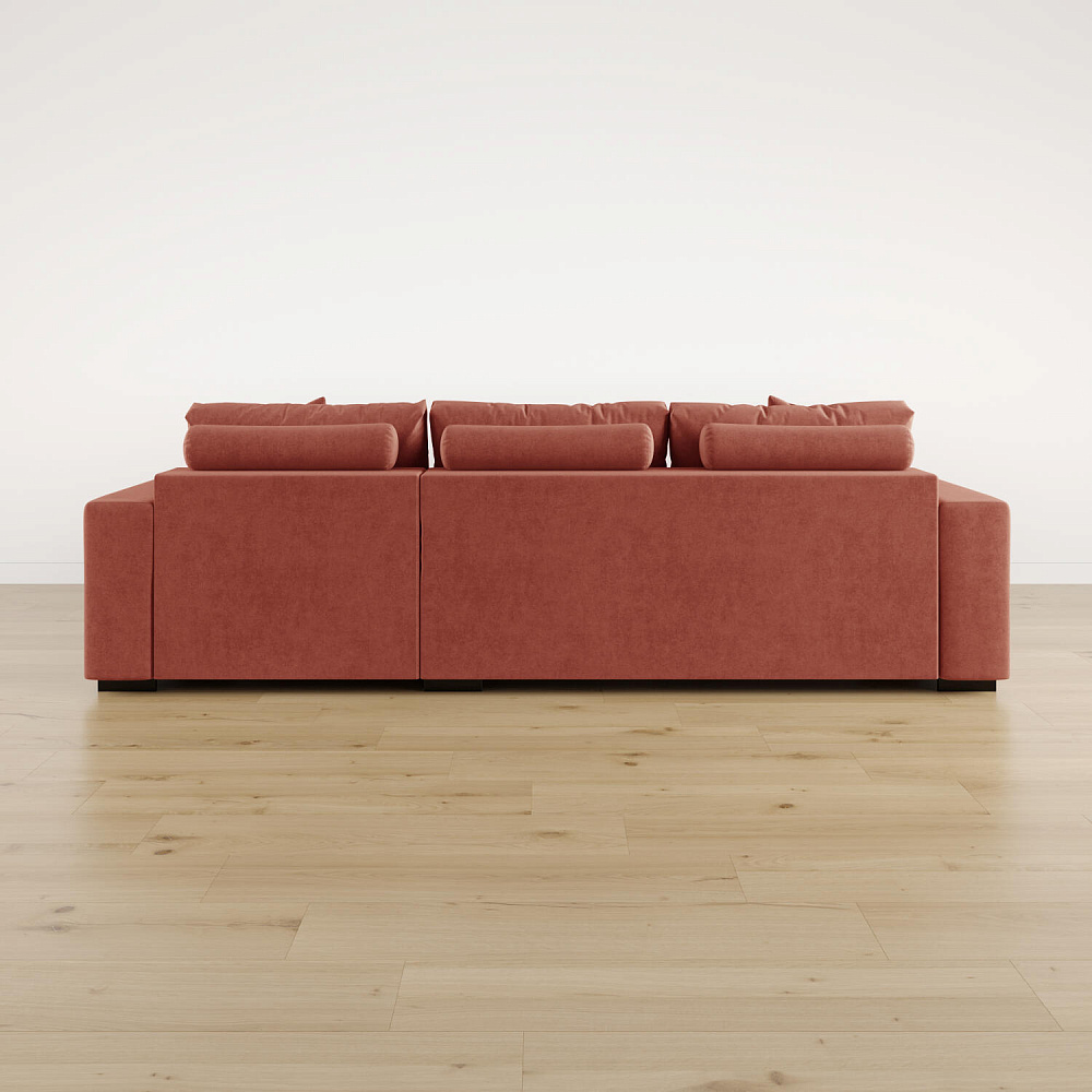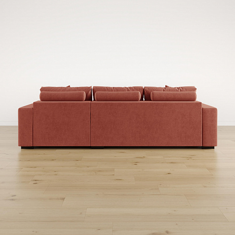 Обратная сторона спинки в обивочной ткани. Диван прекрасно подойдёт для зонирования помещений или расположения в центре комнаты.