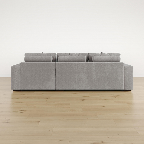 Обратная сторона спинки в обивочной ткани. Диван прекрасно подойдёт для зонирования помещений или расположения в центре комнаты.