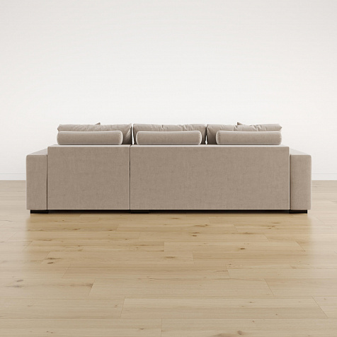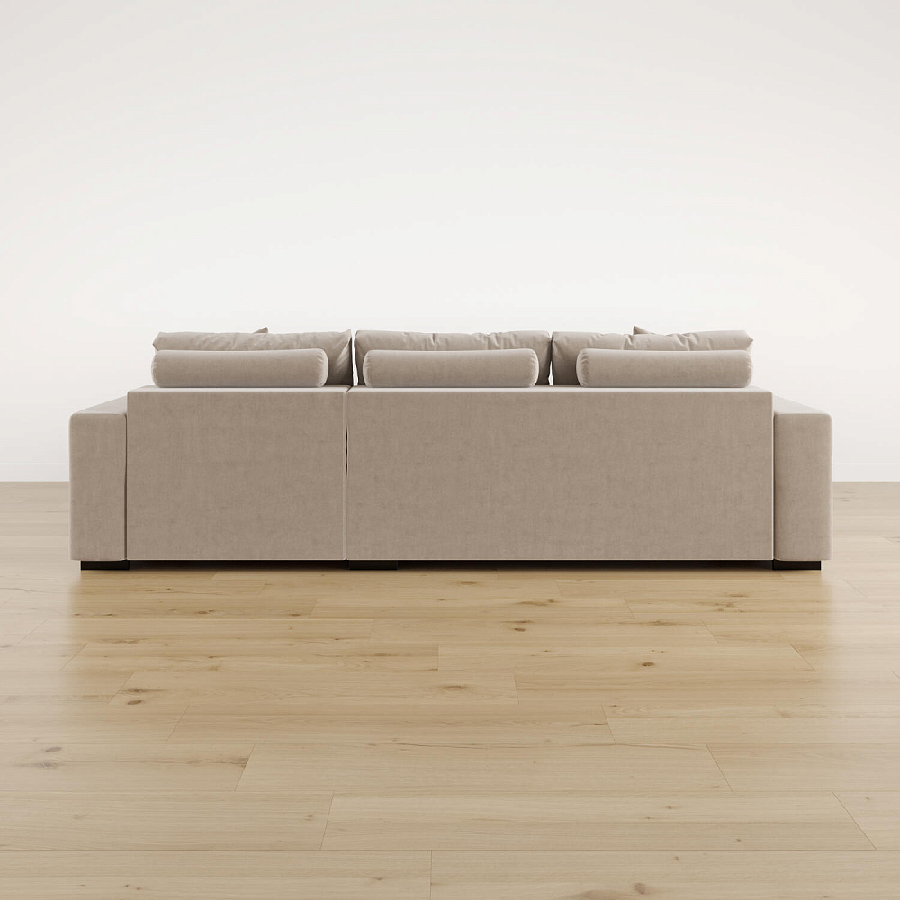 Обратная сторона спинки в обивочной ткани. Диван прекрасно подойдёт для зонирования помещений или расположения в центре комнаты.