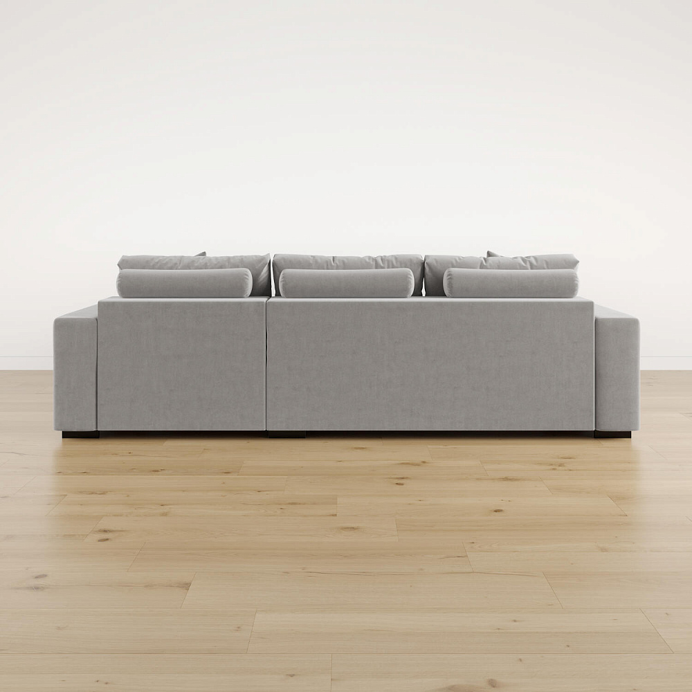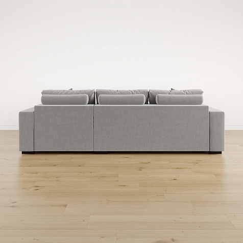 Обратная сторона спинки в обивочной ткани. Диван прекрасно подойдёт для зонирования помещений или расположения в центре комнаты.