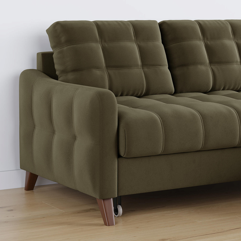 Механизм трансформации «Дельфин». Диван легко и быстро превращается в кровать. Выдвиньте раму с дополнительным спальным местом из-под более широкой части дивана, потяните вверх и вперёд за специальные петли. Подушка поднимется на уровень остальных частей дивана. Подушка выполнена в технической ткани, отличается от обивки по цвету и фактуре.