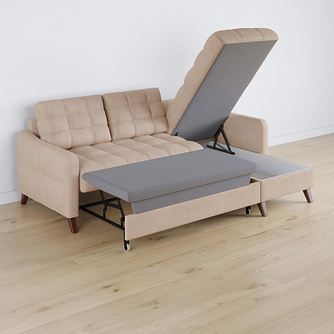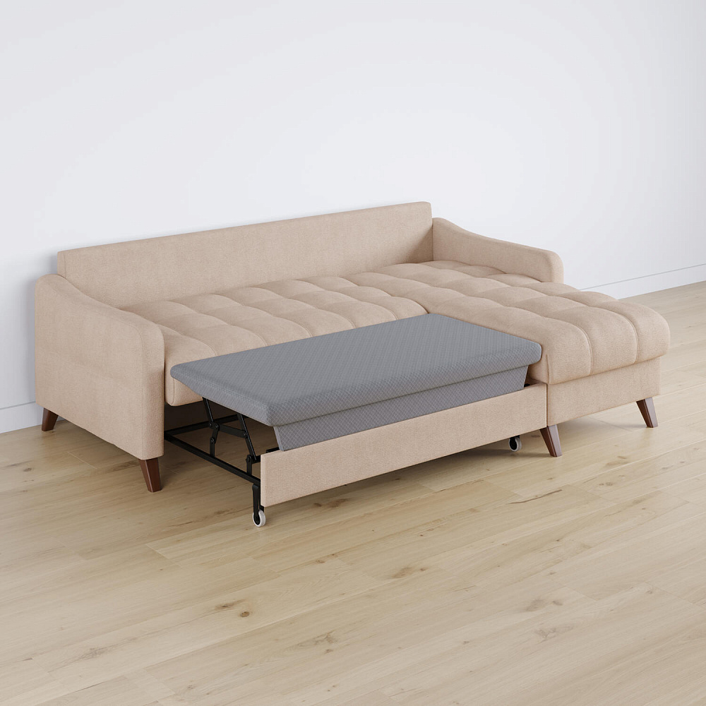 Механизм трансформации «Дельфин». Диван легко и быстро превращается в кровать. Выдвиньте раму с дополнительным спальным местом из-под более широкой части дивана, потяните вверх и вперёд за специальные петли. Подушка поднимется на уровень остальных частей дивана. Подушка выполнена в технической ткани, отличается от обивки по цвету и фактуре.