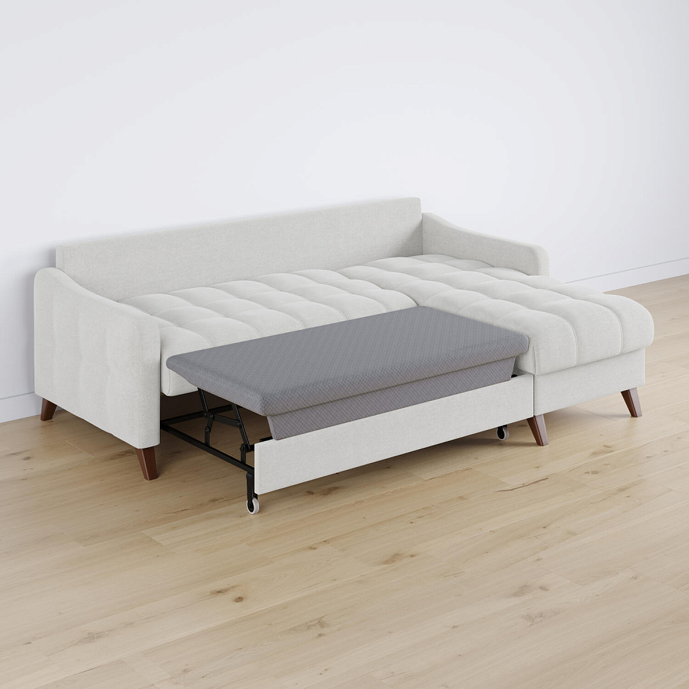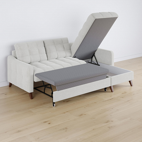 Механизм трансформации «Дельфин». Диван легко и быстро превращается в кровать. Выдвиньте раму с дополнительным спальным местом из-под более широкой части дивана, потяните вверх и вперёд за специальные петли. Подушка поднимется на уровень остальных частей дивана. Подушка выполнена в технической ткани, отличается от обивки по цвету и фактуре.