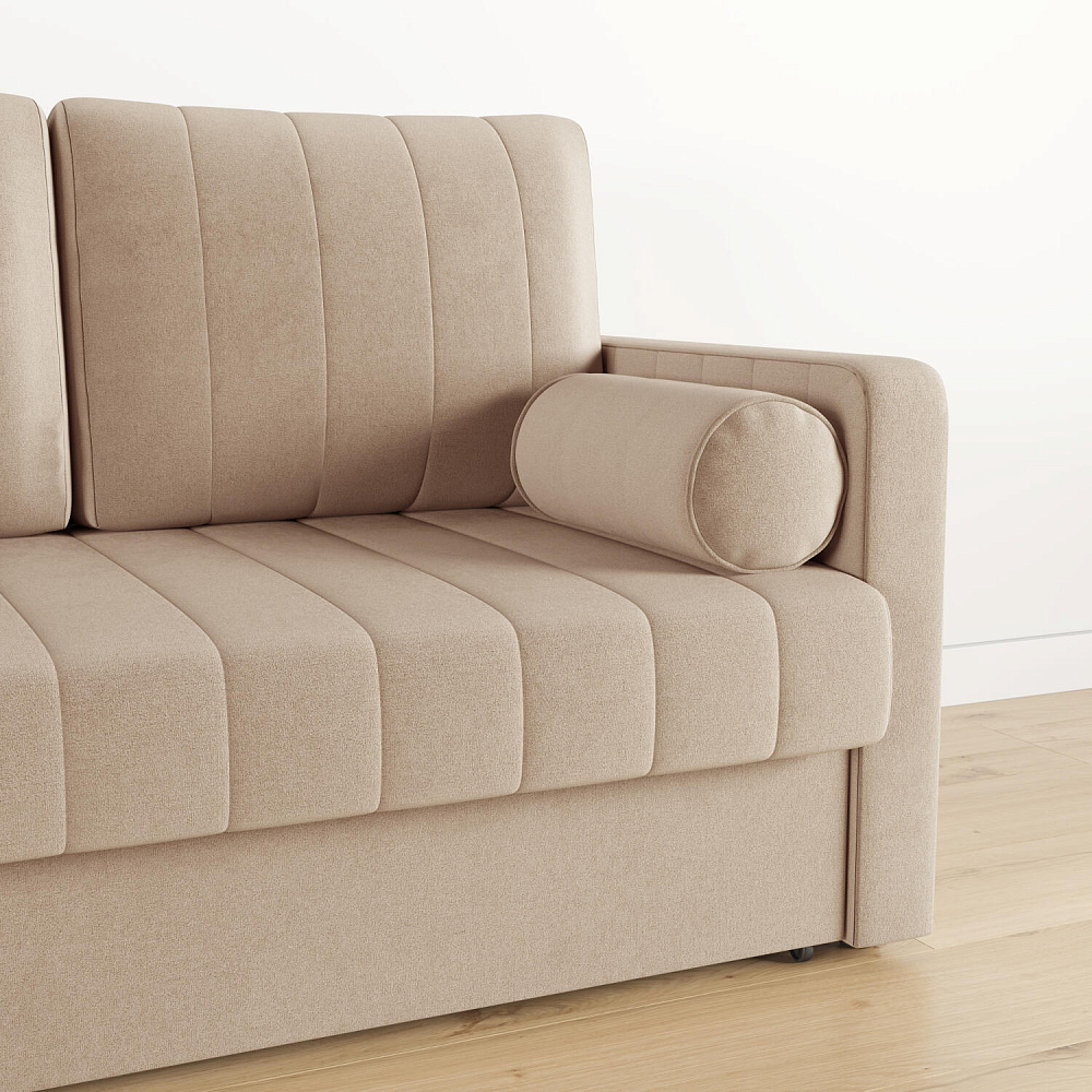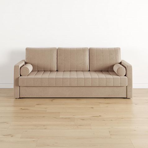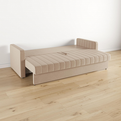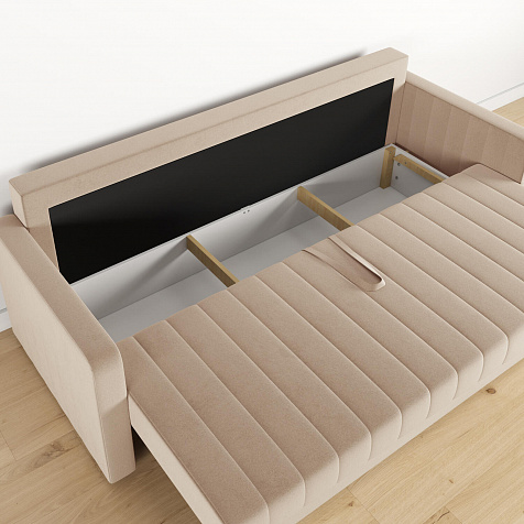 Механизм трансформации «Еврокнижка». Диван легко раскладывается — достаточно выкатить вперёд сиденье и опустить спинку. Отодвигать диван от стены не требуется.