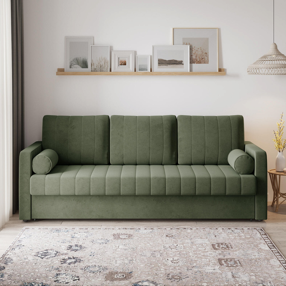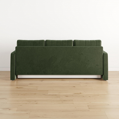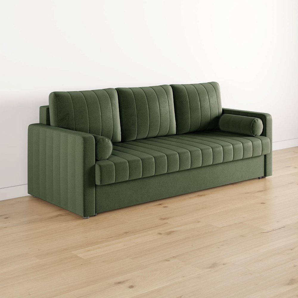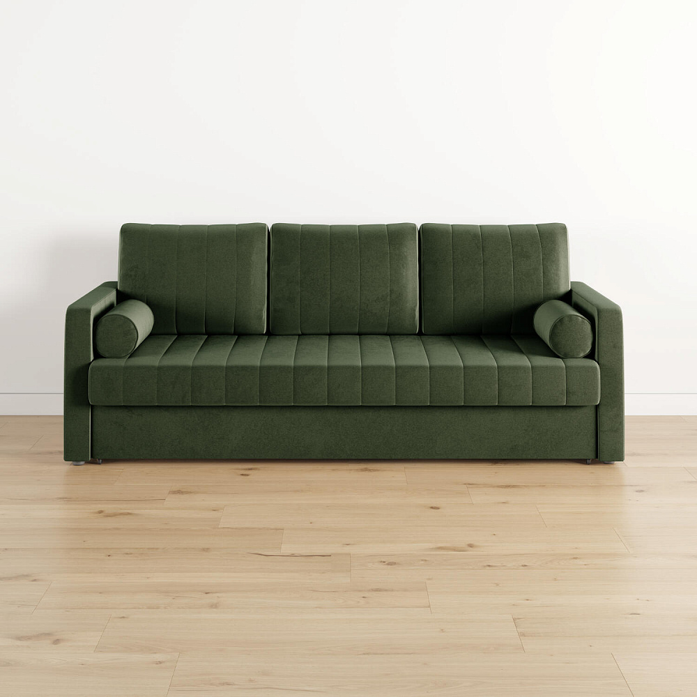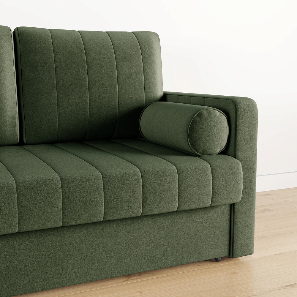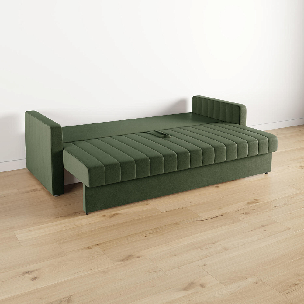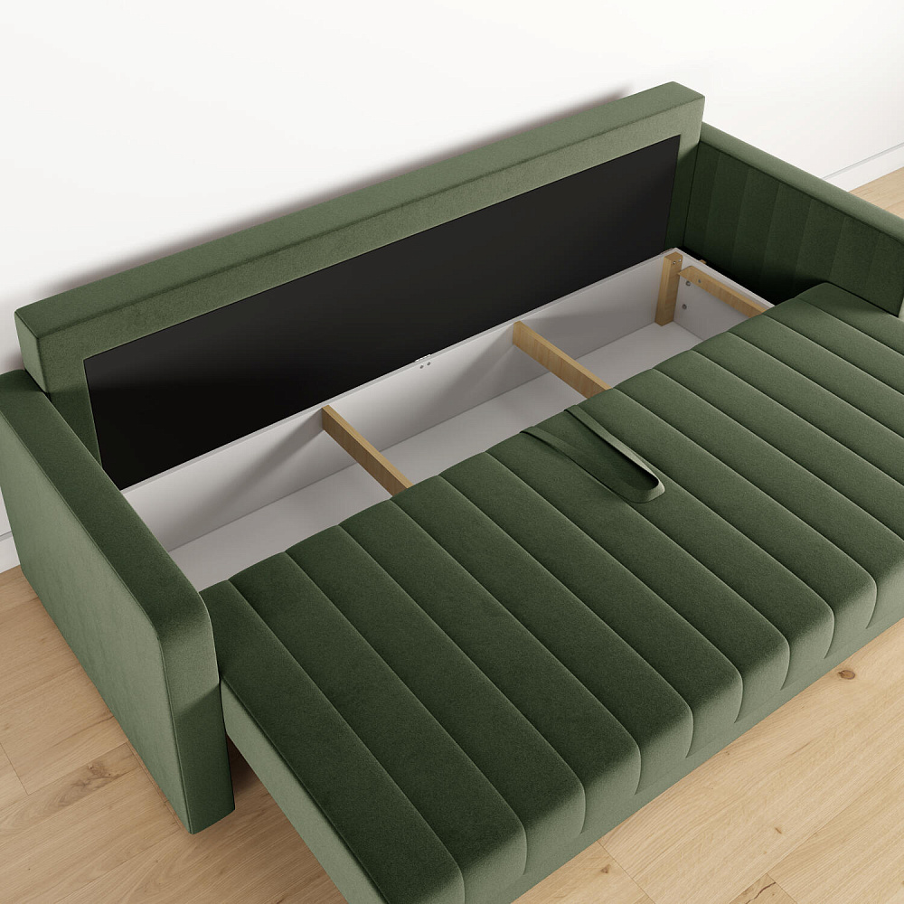 Механизм трансформации «Еврокнижка». Диван легко раскладывается — достаточно выкатить вперёд сиденье и опустить спинку. Отодвигать диван от стены не требуется.
