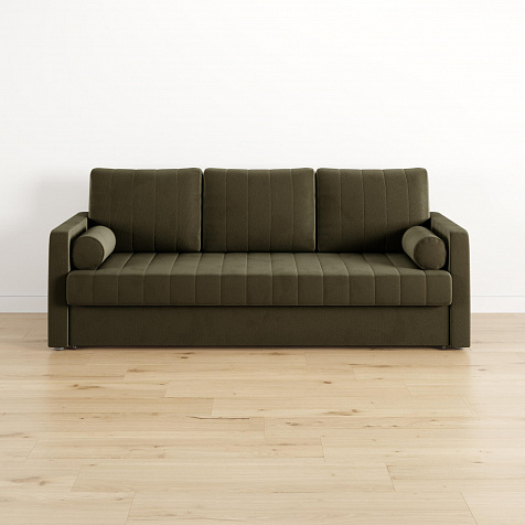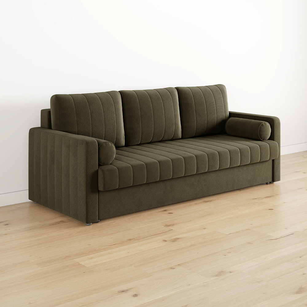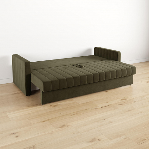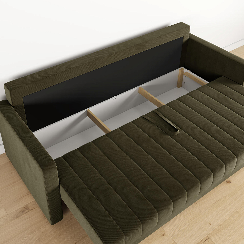 Механизм трансформации «Еврокнижка». Диван легко раскладывается — достаточно выкатить вперёд сиденье и опустить спинку. Отодвигать диван от стены не требуется.