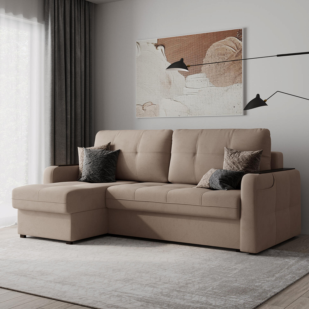 Угловой диван-кровать «Киль-3» — это удобная и функциональная мягкая мебель. Благодаря своему лаконичному дизайну модель может стать центральным элементом интерьера комнаты. Комфортабельное спальное место подходит для ежедневного сна. Дополнительный комфорт обеспечивают накладки на подлокотниках. Приспинные подушки позволяют удобно разместиться на диване, накладку на подлокотнике можно использовать как подставку для чашечки с любимым напитком.
