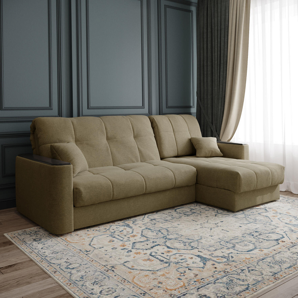 Диван угловой «Камелот» — лучшее сочетание удобства, компактности и функциональности. Модель в лаконичном дизайне поможет оформить уютную и удобную зону для сна и отдыха в небольших гостиных в классическом стиле. Изюминкой модели являются деревянные накладки на подлокотниках, на которых можно разместить пульт от телевизора или чашку чая. Диван создаст в комнате комфортную обстановку и придаст ей неповторимый вид.