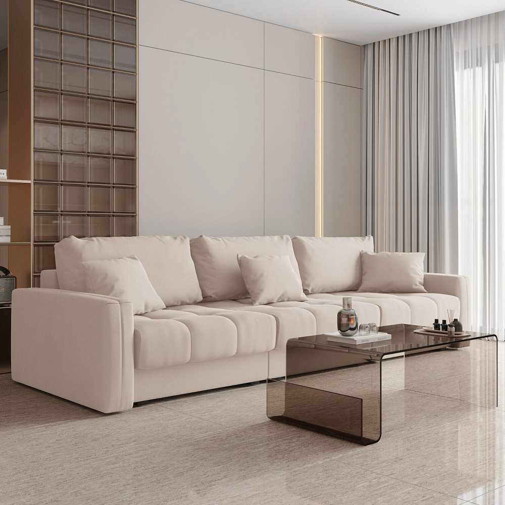 Диван «Дензел» — лучший вариант для ценителей комфорта в сочетании со стильным дизайном. Диван обладает глубокой посадкой, а приспинные и декоративные подушки позволят создать самое удобное место для отдыха. Спинка дивана выполнена в той же обивке, что и основная часть, что даёт возможность использовать диван для зонирования комнаты.