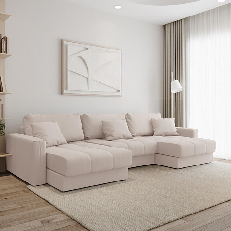 П-образный угловой диван «Дензел» — лучший вариант для ценителей комфорта и удобства в сочетании со стильным дизайном. Диван обладает глубокой посадкой, а приспинные и декоративные подушки позволят создать удобное место для отдыха. Угловая модель с двумя оттоманками займёт своё идеальное место в пространстве комнаты или студии. Спинка модели выполнена в обивочной ткани, что даёт возможность использовать диван для зонирования комнаты.