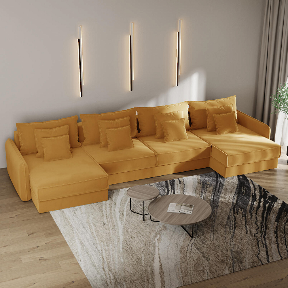- Размер спального места — 400 х 167 см. Диван легко трансформируется в полноценное спальное место для сна и отдыха двух человек.