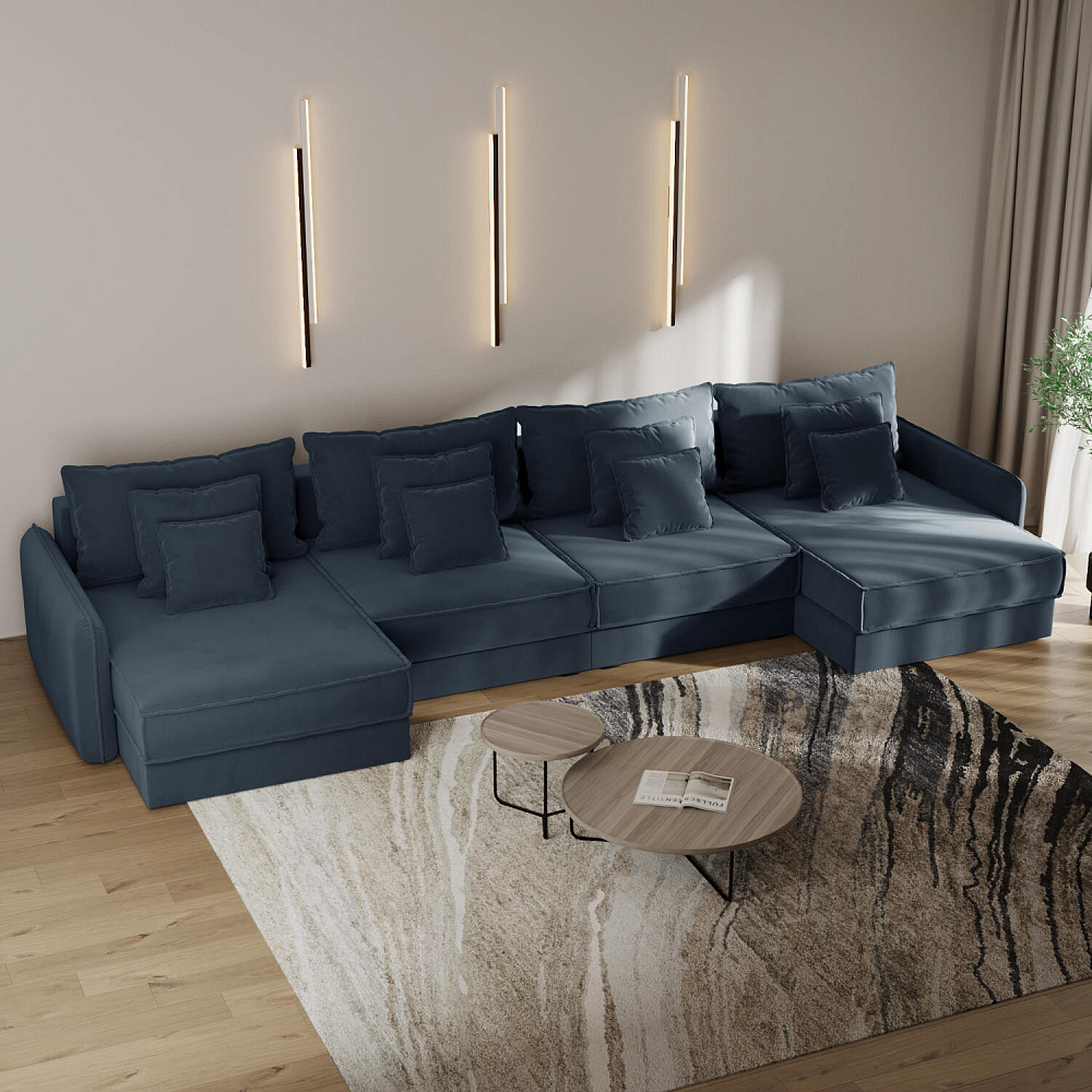 - 12 подушек в комплекте. 4 приспинных и 8 декоративных подушек разных размеров позволят скорректировать глубину посадки.