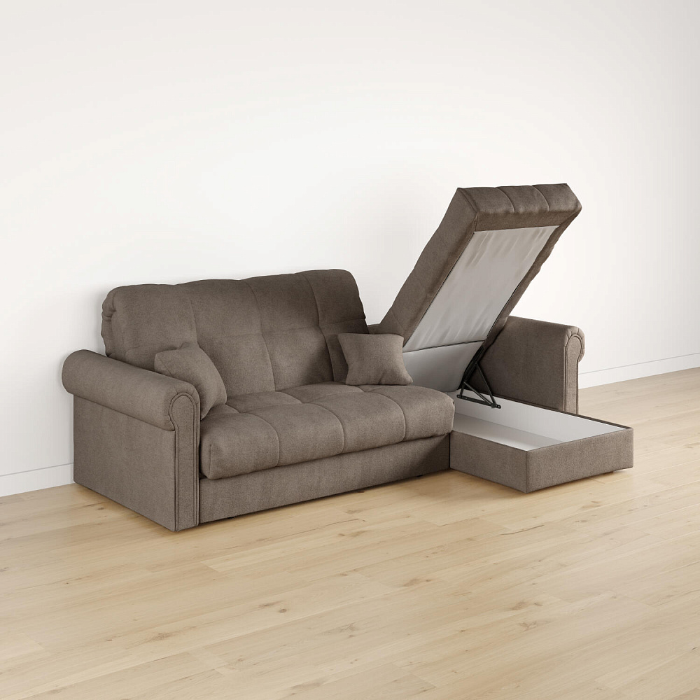 - Короб для белья. В оттоманке дивана скрыт просторный бельевой ящик, в котором можно разместить все необходимые постельные принадлежности.