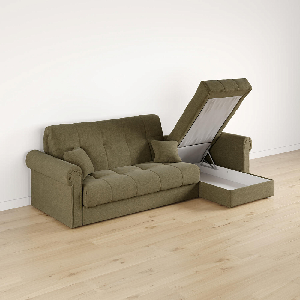 - Короб для белья. В оттоманке дивана скрыт просторный бельевой ящик, в котором можно разместить все необходимые постельные принадлежности.