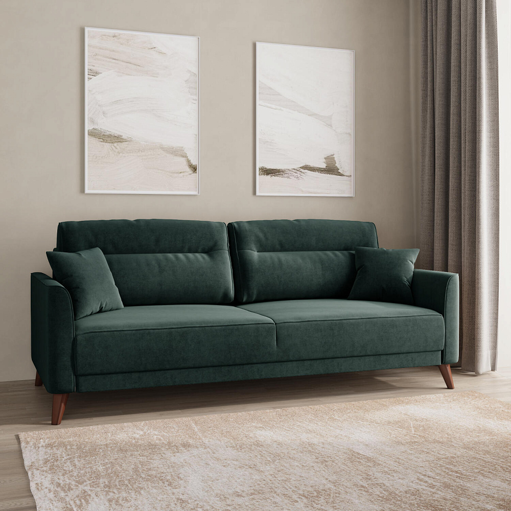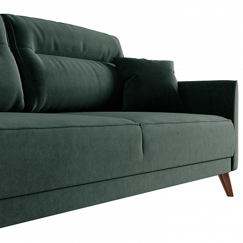Диван «Монз» с глубокой посадкой оснащён механизмом трансформации и большим бельевым коробом. Дизайн отличается оригинальной строчкой на сиденье и приспинных подушках, декоративными подушками в комплекте и узкими подлокотниками. Высокие опоры визуально облегчают конструкцию дивана и открывают доступ к уборке пространства под ним.