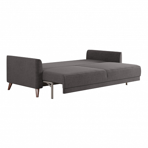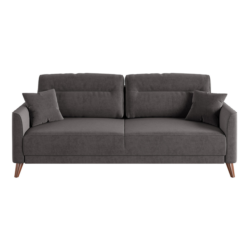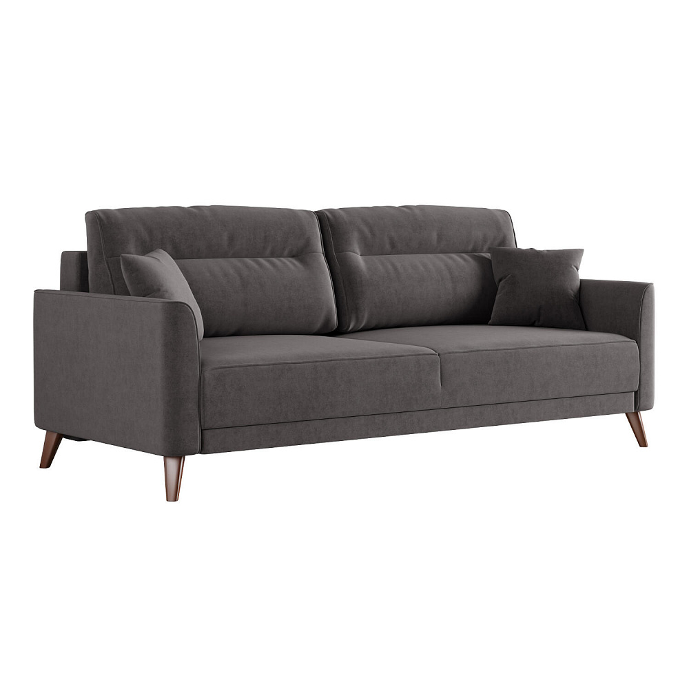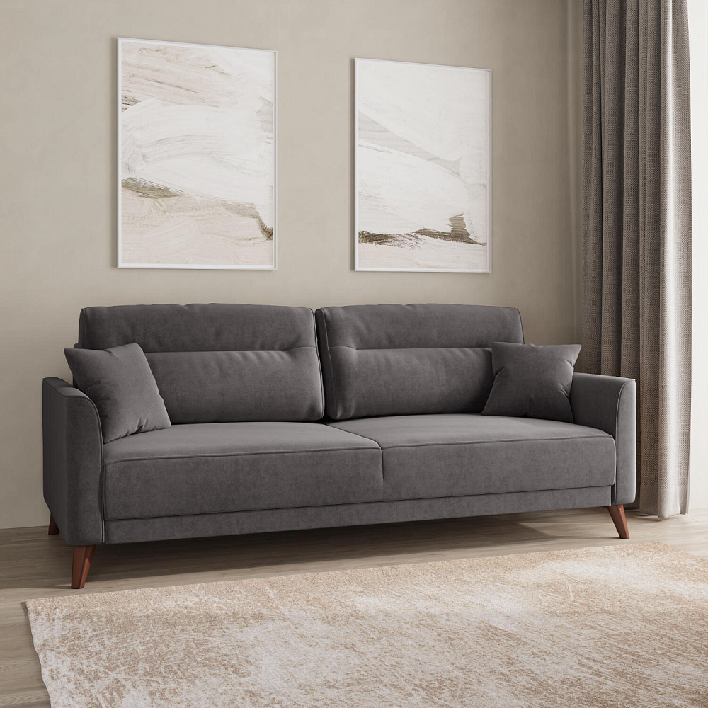 Диван «Монз» с глубокой посадкой оснащён механизмом трансформации и большим бельевым коробом. Дизайн отличается оригинальной строчкой на сиденье и приспинных подушках, декоративными подушками в комплекте и узкими подлокотниками. Высокие опоры визуально облегчают конструкцию дивана и открывают доступ к уборке пространства под ним.