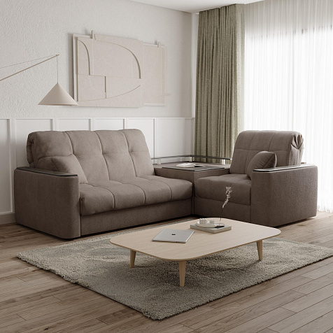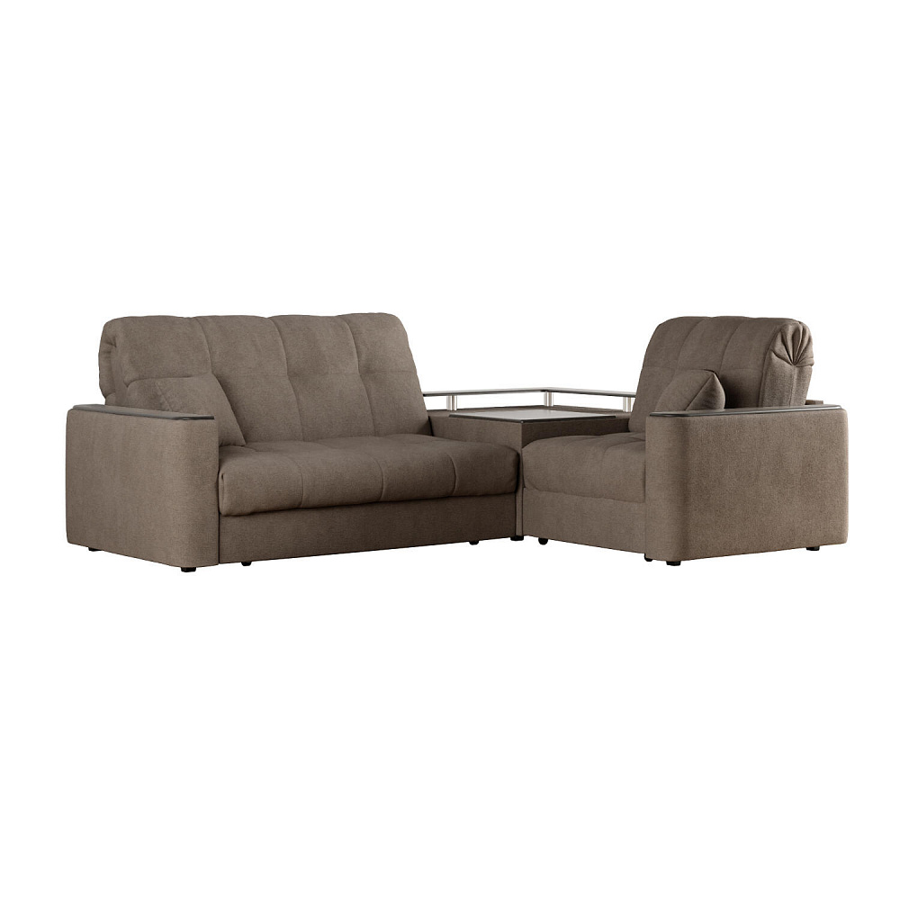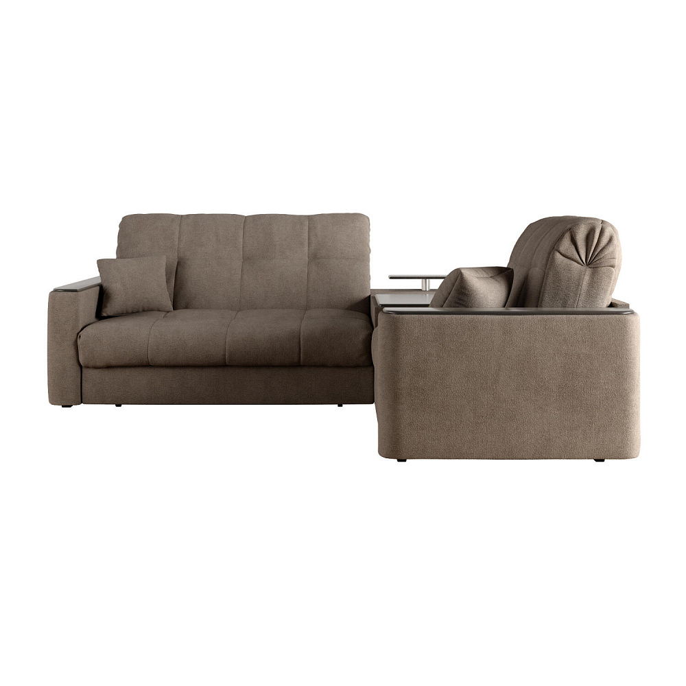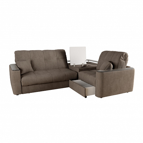 Диван угловой «Камелот» с баром станет главным местом для отдыха и приема гостей. Модель оснащена баром, на котором можно расположить еду и напитки во время просмотра фильмов и сериалов. Пропорциональные формы, плавные линии на сиденье и спинке подчеркивают лаконичный дизайн, поэтому диван подойдёт для любого современного интерьера. Диван создаст в комнате комфортную обстановку и придаст ей неповторимый вид.