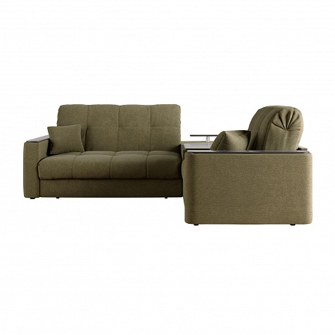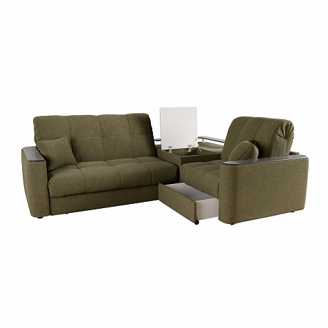Диван угловой «Камелот» с баром станет главным местом для отдыха и приема гостей. Модель оснащена баром, на котором можно расположить еду и напитки во время просмотра фильмов и сериалов. Пропорциональные формы, плавные линии на сиденье и спинке подчеркивают лаконичный дизайн, поэтому диван подойдёт для любого современного интерьера. Диван создаст в комнате комфортную обстановку и придаст ей неповторимый вид.