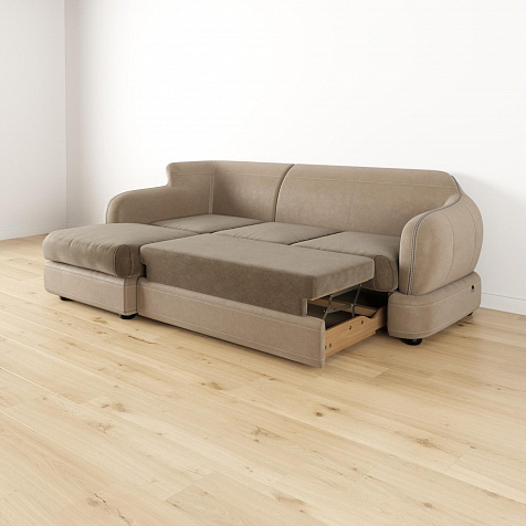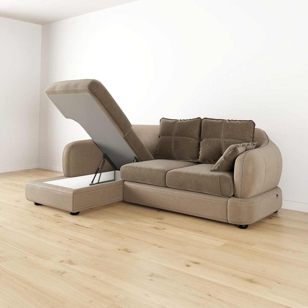 - Ящик для белья. В конструкции дивана предусмотрено вместительное отделение под подъемной угловой частью для хранения постельных принадлежностей.