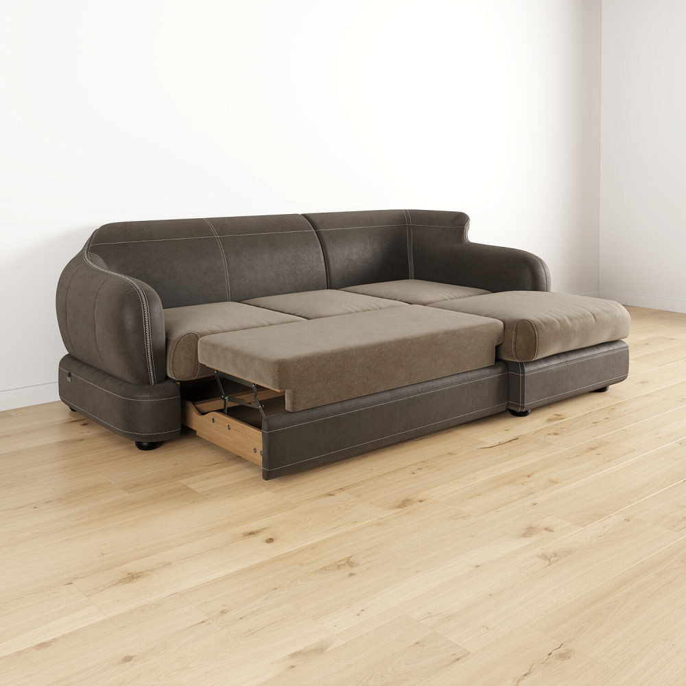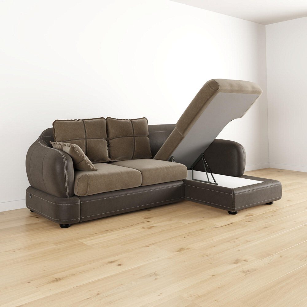 - Ящик для белья. В конструкции дивана предусмотрено вместительное отделение под подъемной угловой частью для хранения постельных принадлежностей.