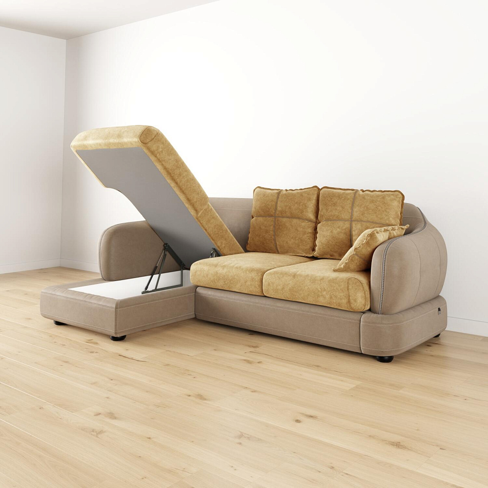 - Ящик для белья. В конструкции дивана предусмотрено вместительное отделение под подъемной угловой частью для хранения постельных принадлежностей.