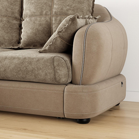 - Обивка из искусственной замши и велюра. В качестве обивки спинки, подлокотников и царги используется искусственная замша, которая устойчива к истиранию и выцветанию, не подвержена растягиванию, не лоснится, не образует катышков, долговечна и не требовательна в уходе. Подушки выполнены в обивке из велюра «Felicita», который отличается высокой воздухопроницаемостью и не растягивается. Покрытие «Soft» придаёт мягкость и свойства «релаксанта».