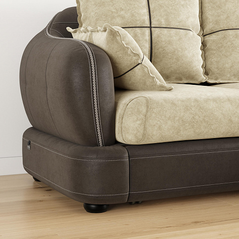 - Обивка из искусственной замши и велюра. В качестве обивки спинки, подлокотников и царги используется искусственная замша, которая устойчива к истиранию и выцветанию, не подвержена растягиванию, не лоснится, не образует катышков, долговечна и не требовательна в уходе. Подушки выполнены в обивке из велюра «Felicita», который отличается высокой воздухопроницаемостью и не растягивается. Покрытие «Soft» придаёт мягкость и свойства «релаксанта».