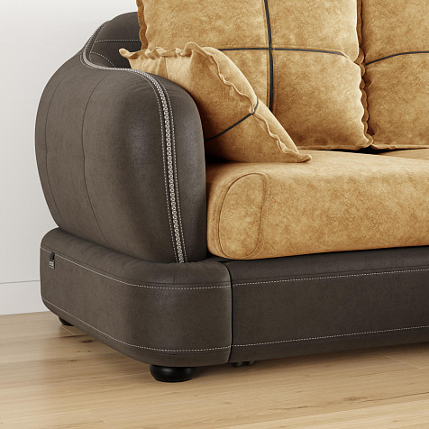 - Обивка из искусственной замши и велюра. В качестве обивки спинки, подлокотников и царги используется искусственная замша, которая устойчива к истиранию и выцветанию, не подвержена растягиванию, не лоснится, не образует катышков, долговечна и не требовательна в уходе. Подушки выполнены в обивке из велюра «Felicita», который отличается высокой воздухопроницаемостью и не растягивается. Покрытие «Soft» придаёт мягкость и свойства «релаксанта».