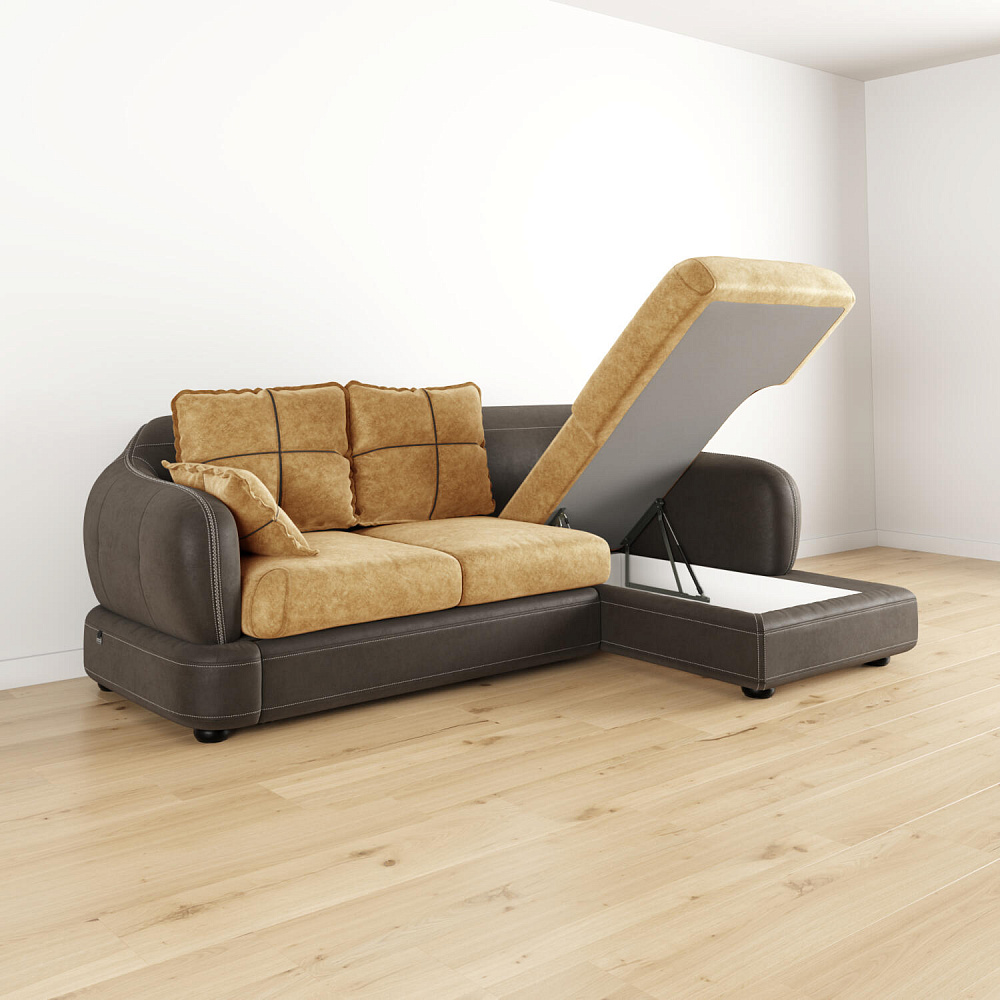 - Ящик для белья. В конструкции дивана предусмотрено вместительное отделение под подъемной угловой частью для хранения постельных принадлежностей.