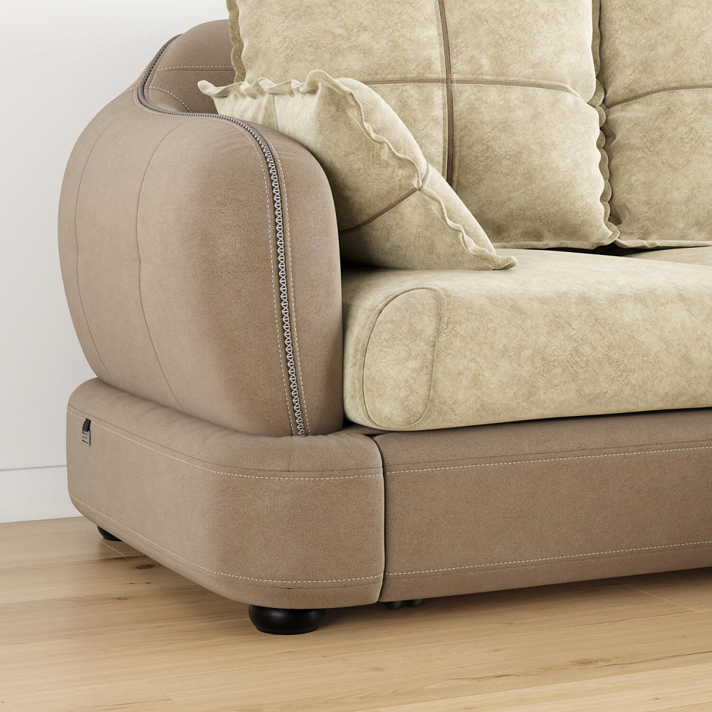 - Обивка из искусственной замши и велюра. В качестве обивки спинки, подлокотников и царги используется искусственная замша, которая устойчива к истиранию и выцветанию, не подвержена растягиванию, не лоснится, не образует катышков, долговечна и не требовательна в уходе. Подушки выполнены в обивке из велюра «Felicita», который отличается высокой воздухопроницаемостью и не растягивается. Покрытие «Soft» придаёт мягкость и свойства «релаксанта».