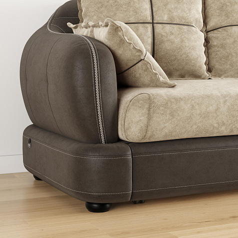 - Обивка из искусственной замши и микрофибры. В качестве обивки спинки, подлокотников и царги используется искусственная замша, которая устойчива к истиранию и выцветанию, не подвержена растягиванию, не лоснится, не образует катышков, долговечна и не требовательна в уходе. Подушки выполнены в обивке из велюра «Felicita», который отличается высокой воздухопроницаемостью и не растягивается. Покрытие «Soft» придаёт мягкость и свойства «релаксанта».