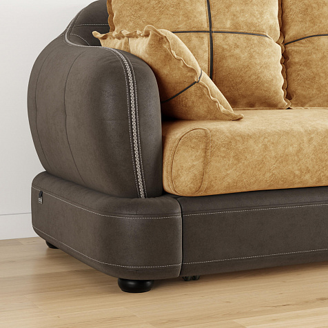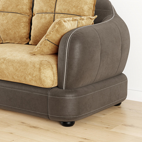 - Обивка из искусственной замши и микрофибры. В качестве обивки спинки, подлокотников и царги используется искусственная замша, которая устойчива к истиранию и выцветанию, не подвержена растягиванию, не лоснится, не образует катышков, долговечна и не требовательна в уходе. Подушки выполнены в обивке из велюра «Felicita», который отличается высокой воздухопроницаемостью и не растягивается. Покрытие «Soft» придаёт мягкость и свойства «релаксанта».