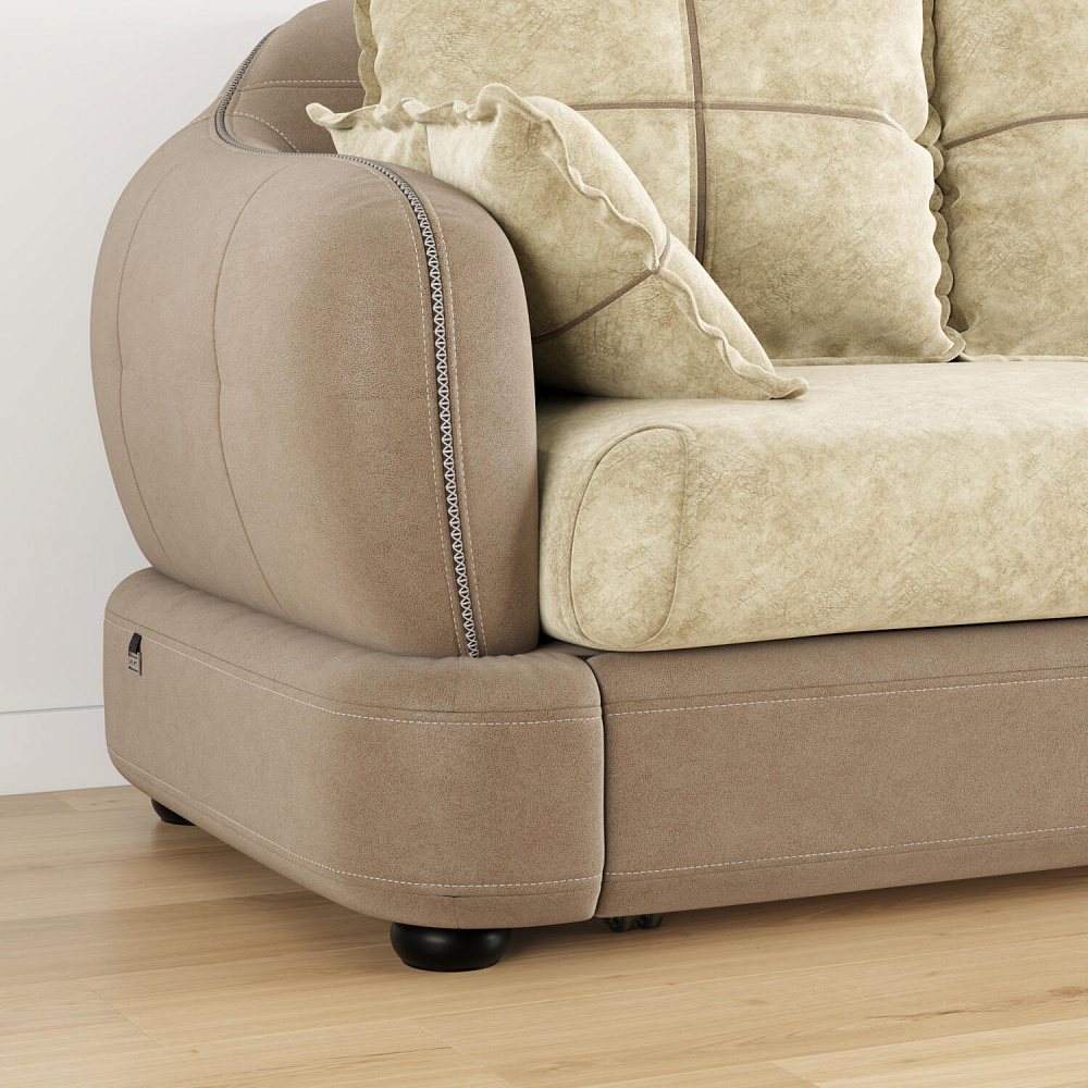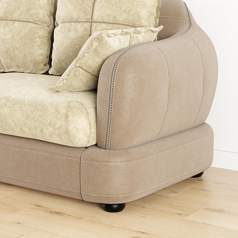- Обивка из искусственной замши и микрофибры. В качестве обивки спинки, подлокотников и царги используется искусственная замша, которая устойчива к истиранию и выцветанию, не подвержена растягиванию, не лоснится, не образует катышков, долговечна и не требовательна в уходе. Подушки выполнены в обивке из велюра «Felicita», который отличается высокой воздухопроницаемостью и не растягивается. Покрытие «Soft» придаёт мягкость и свойства «релаксанта».
