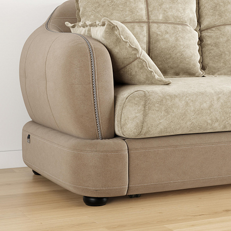 - Обивка из искусственной замши и микрофибры. В качестве обивки спинки, подлокотников и царги используется искусственная замша, которая устойчива к истиранию и выцветанию, не подвержена растягиванию, не лоснится, не образует катышков, долговечна и не требовательна в уходе. Подушки выполнены в обивке из велюра «Felicita», который отличается высокой воздухопроницаемостью и не растягивается. Покрытие «Soft» придаёт мягкость и свойства «релаксанта».