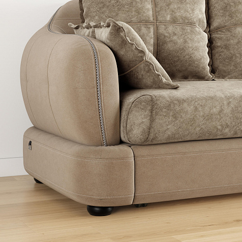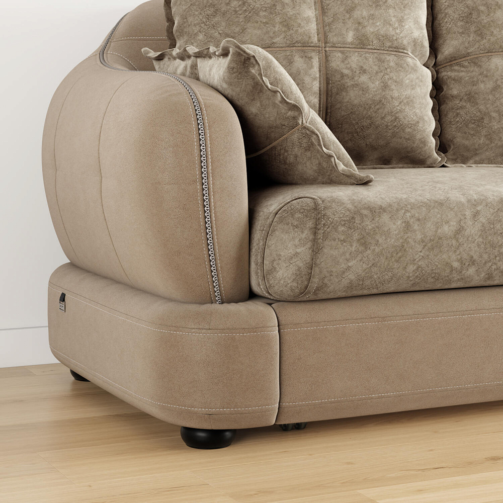 - Обивка из искусственной замши и микрофибры. В качестве обивки спинки, подлокотников и царги используется искусственная замша, которая устойчива к истиранию и выцветанию, не подвержена растягиванию, не лоснится, не образует катышков, долговечна и не требовательна в уходе. Подушки выполнены в обивке из велюра «Felicita», который отличается высокой воздухопроницаемостью и не растягивается. Покрытие «Soft» придаёт мягкость и свойства «релаксанта».