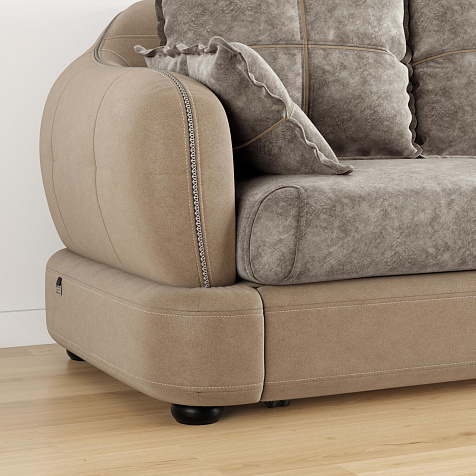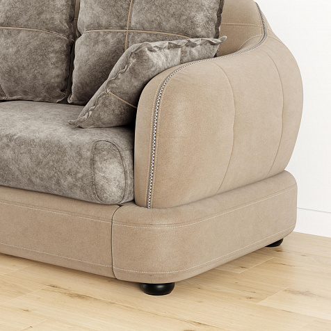 - Обивка из искусственной замши и микрофибры. В качестве обивки спинки, подлокотников и царги используется искусственная замша, которая устойчива к истиранию и выцветанию, не подвержена растягиванию, не лоснится, не образует катышков, долговечна и не требовательна в уходе. Подушки выполнены в обивке из велюра «Felicita», который отличается высокой воздухопроницаемостью и не растягивается. Покрытие «Soft» придаёт мягкость и свойства «релаксанта».