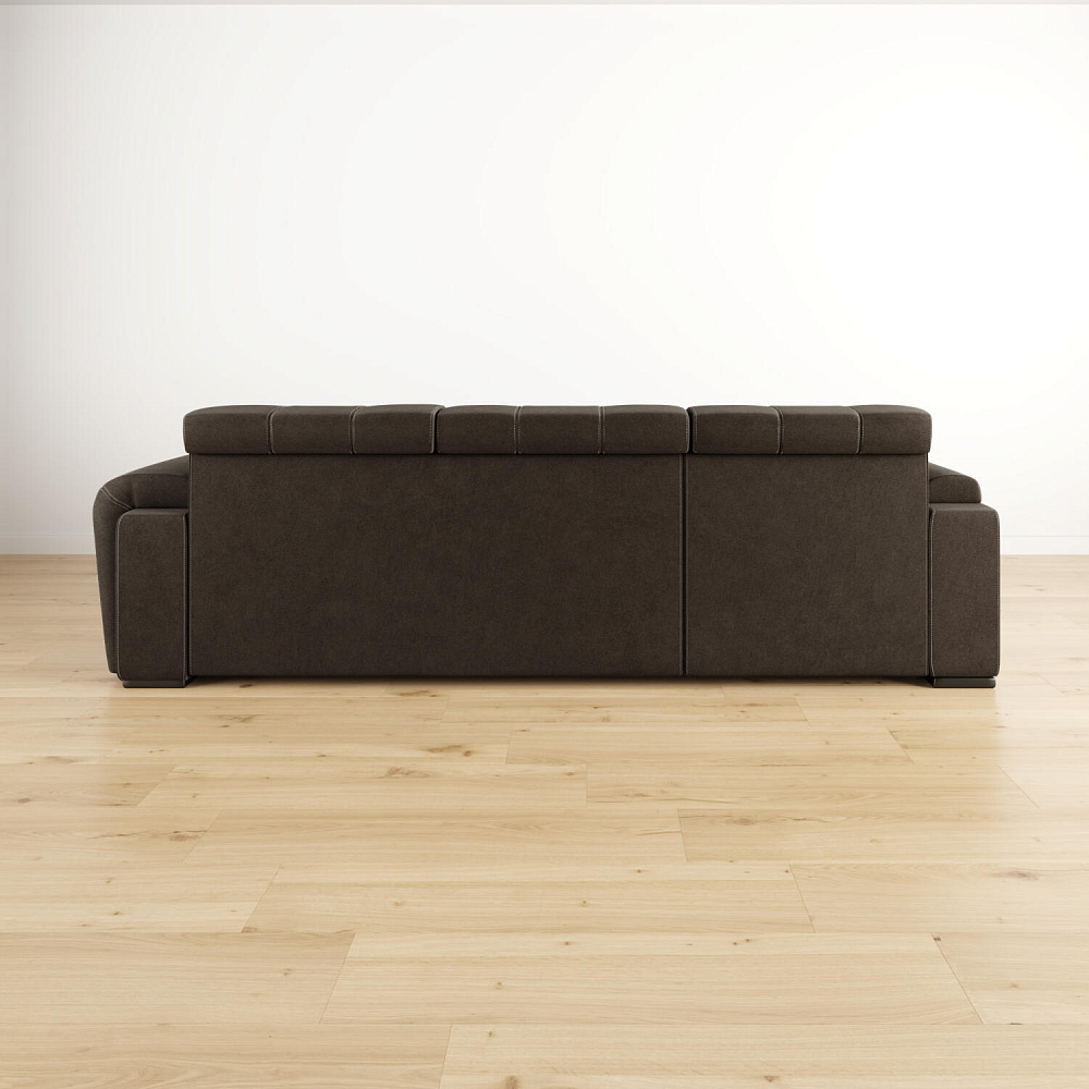 - Дизайн «360 градусов». Спинка выполнена в той же обивке, что и весь диван — модель будет изумительно смотреться как у стены, так и в центре комнаты.