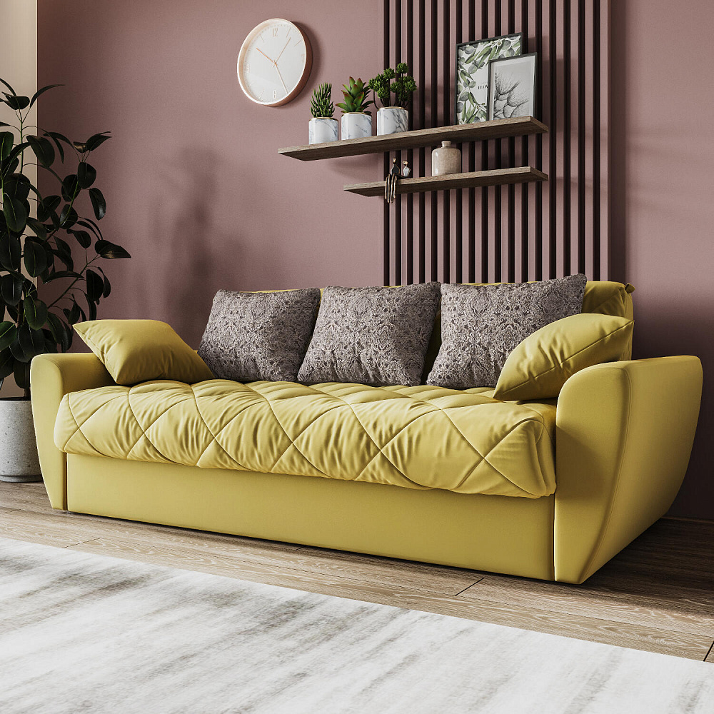 Прямой трехместный диван-кровать «Тэйлор» - это удобная и многофункциональная модель, которая великолепно вписывается в любой интерьер. Диван имеет сверхкомфортную глубокую посадку, спальное место для здорового отдыха и полноценного сна и встроенные вместительные ящики для белья. Глубину посадки легко регулировать с помощью больших приспинных и декоративных малых подушек для максимального удобного отдыха. Диван «Тэйлор» - это простота в использовании, надежность и безупречный комфорт.