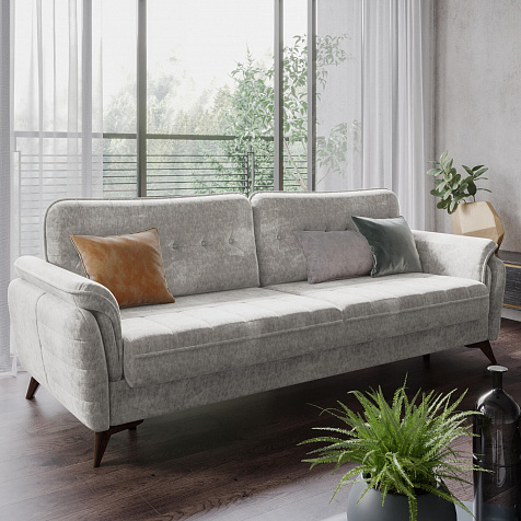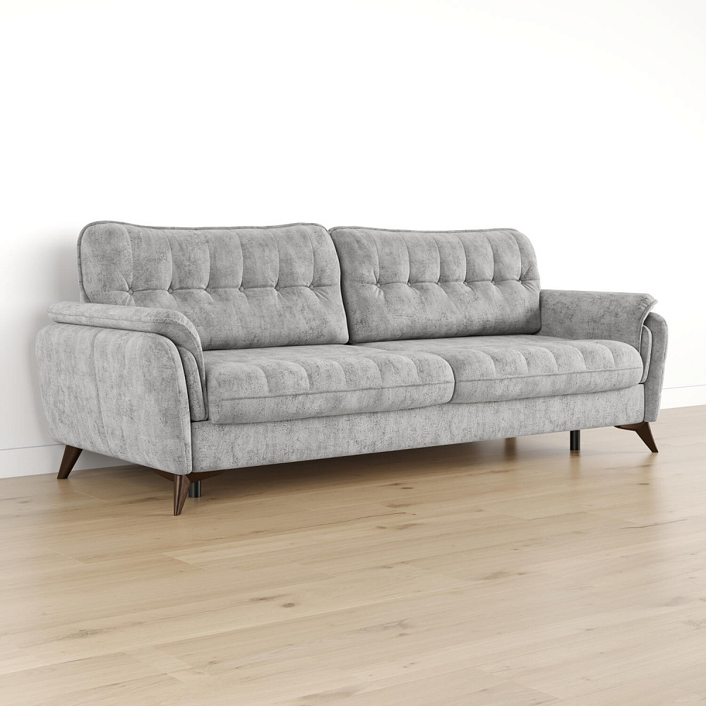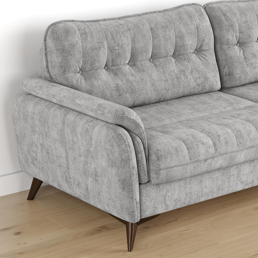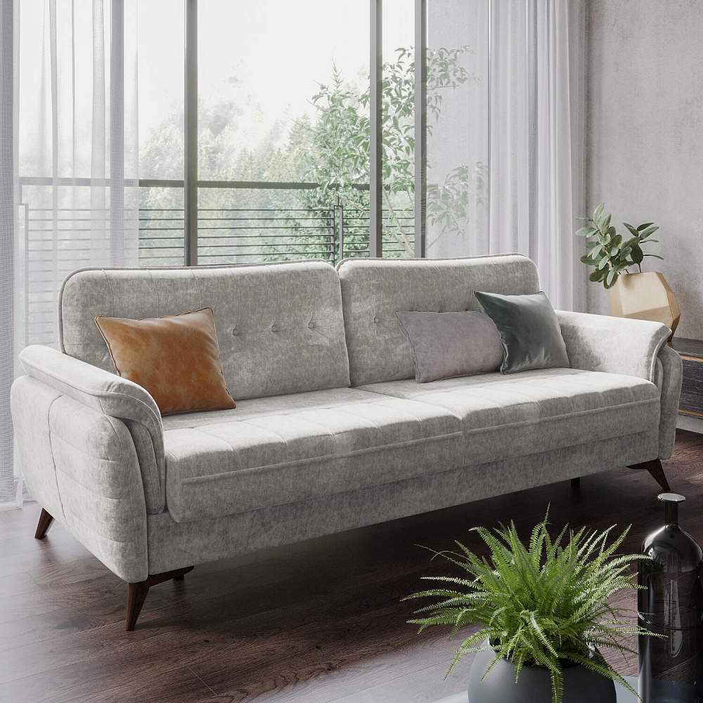 Диван «Корфу» подойдёт тем, кто ищет комфортную посадку, спальное место и вместительный бельевой ящик в одном изделии. Модель возвышается на аккуратных коричневых опорах и словно парит в воздухе. Элегантный диван «Корфу» с декоративными пуговицами, кантом и стёжками будет гармонично смотреться у стены в любом помещении.
