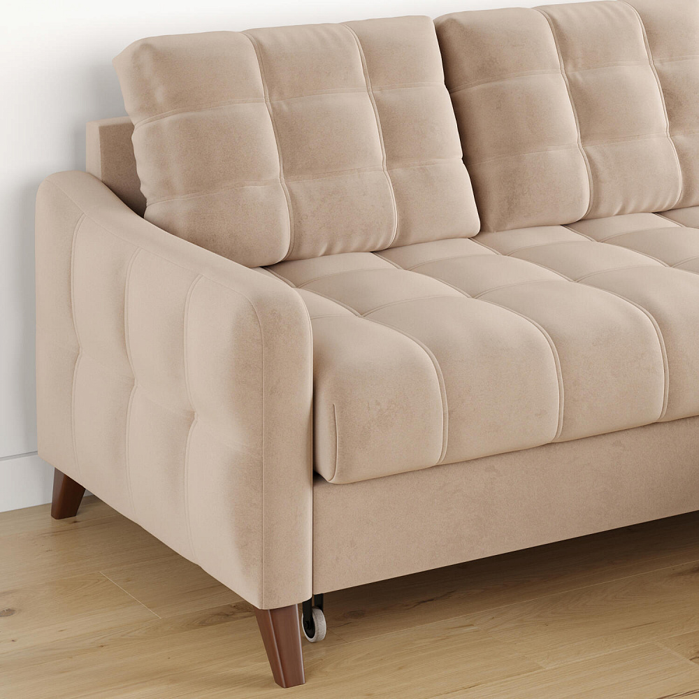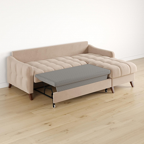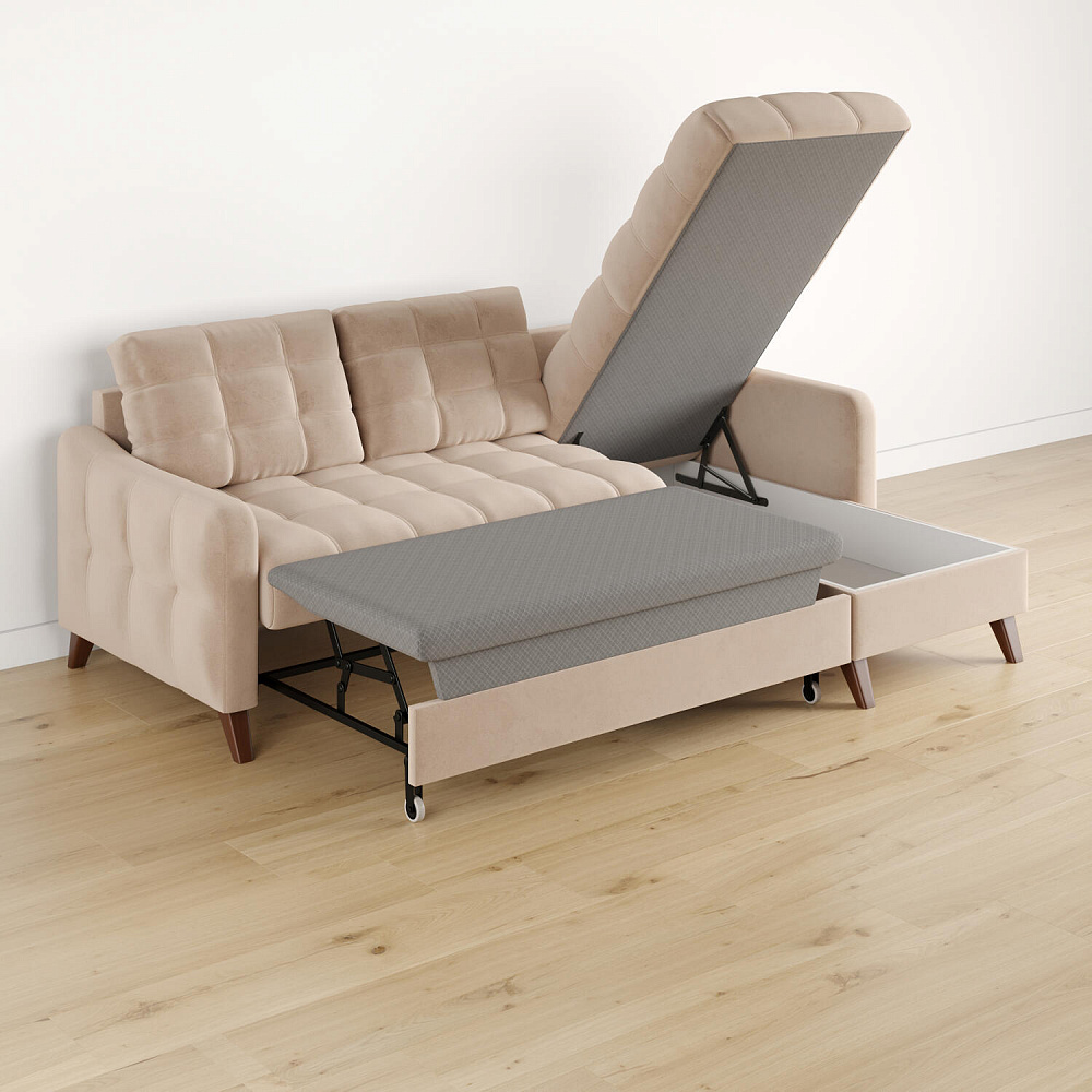 Механизм трансформации «Дельфин». Диван легко и быстро превращается в кровать. Выдвиньте раму с дополнительным спальным местом из-под более широкой части дивана, потяните вверх и вперёд за специальные петли. Подушка поднимется на уровень остальных частей дивана. Подушка выполнена в технической ткани, отличается от обивки по цвету и фактуре.