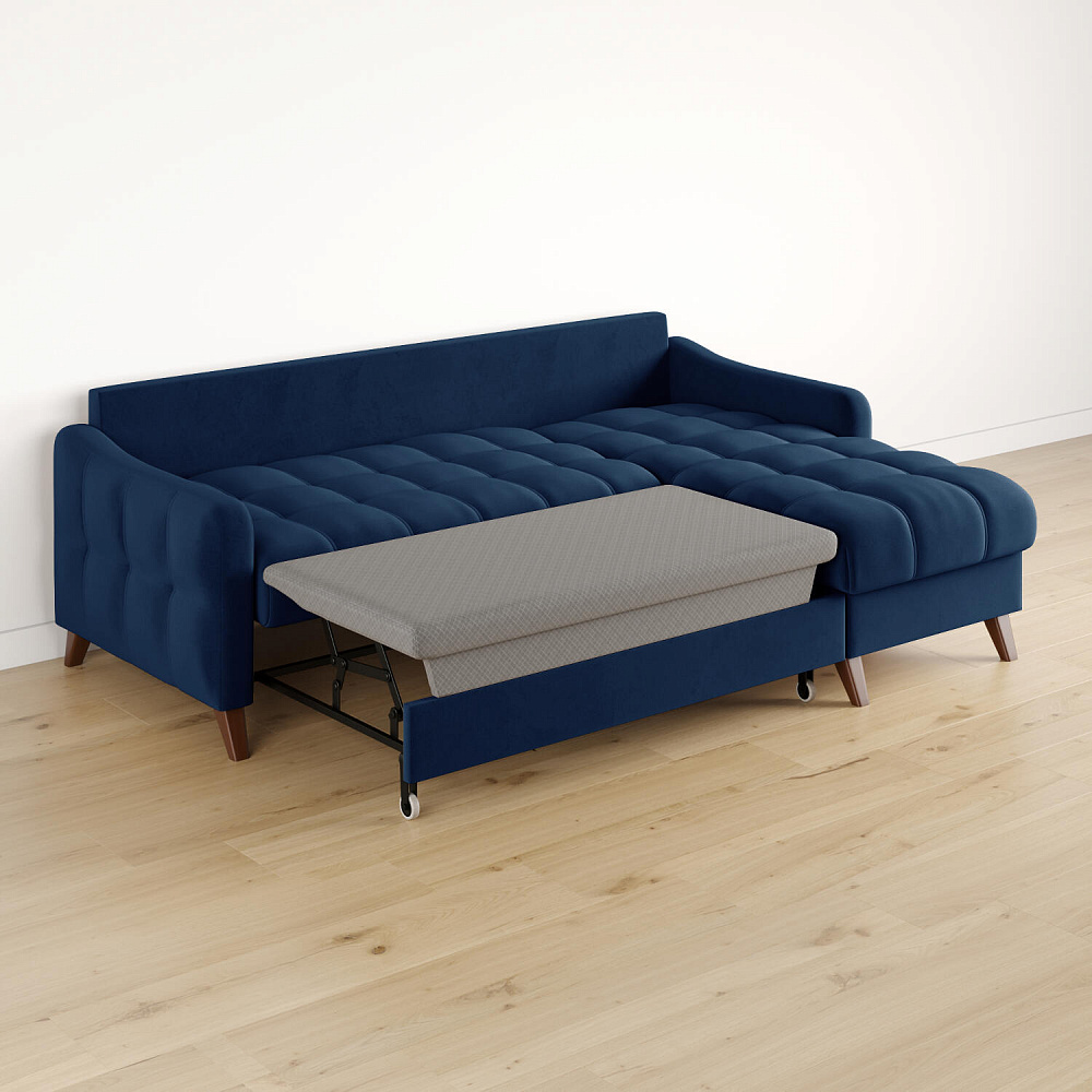 Механизм трансформации «Дельфин». Диван легко и быстро превращается в кровать. Выдвиньте раму с дополнительным спальным местом из-под более широкой части дивана, потяните вверх и вперёд за специальные петли. Подушка поднимется на уровень остальных частей дивана. Подушка выполнена в технической ткани, отличается от обивки по цвету и фактуре.