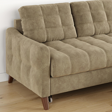 Механизм трансформации «Дельфин». Диван легко и быстро превращается в кровать. Выдвиньте раму с дополнительным спальным местом из-под более широкой части дивана, потяните вверх и вперёд за специальные петли. Подушка поднимется на уровень остальных частей дивана. Подушка выполнена в технической ткани, отличается от обивки по цвету и фактуре.