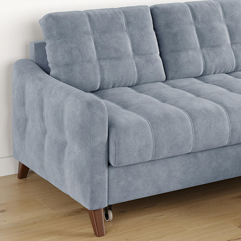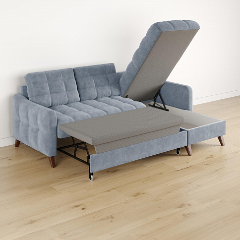 Механизм трансформации «Дельфин». Диван легко и быстро превращается в кровать. Выдвиньте раму с дополнительным спальным местом из-под более широкой части дивана, потяните вверх и вперёд за специальные петли. Подушка поднимется на уровень остальных частей дивана. Подушка выполнена в технической ткани, отличается от обивки по цвету и фактуре.