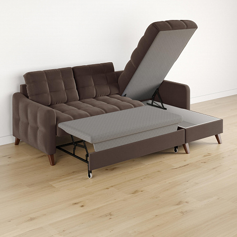 Механизм трансформации «Дельфин». Диван легко и быстро превращается в кровать. Выдвиньте раму с дополнительным спальным местом из-под более широкой части дивана, потяните вверх и вперёд за специальные петли. Подушка поднимется на уровень остальных частей дивана. Подушка выполнена в технической ткани, отличается от обивки по цвету и фактуре.