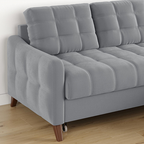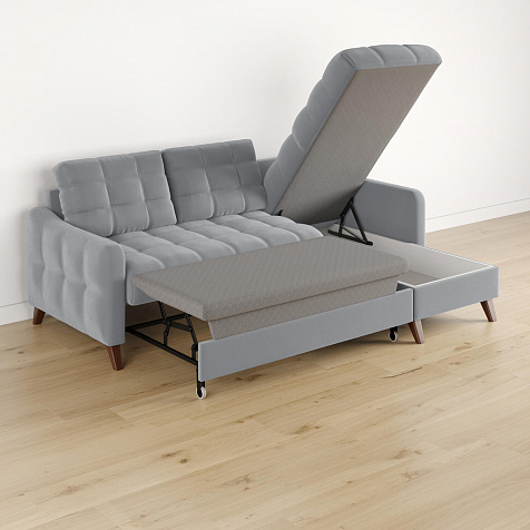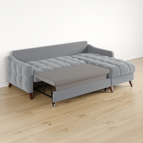 Механизм трансформации «Дельфин». Диван легко и быстро превращается в кровать. Выдвиньте раму с дополнительным спальным местом из-под более широкой части дивана, потяните вверх и вперёд за специальные петли. Подушка поднимется на уровень остальных частей дивана. Подушка выполнена в технической ткани, отличается от обивки по цвету и фактуре.