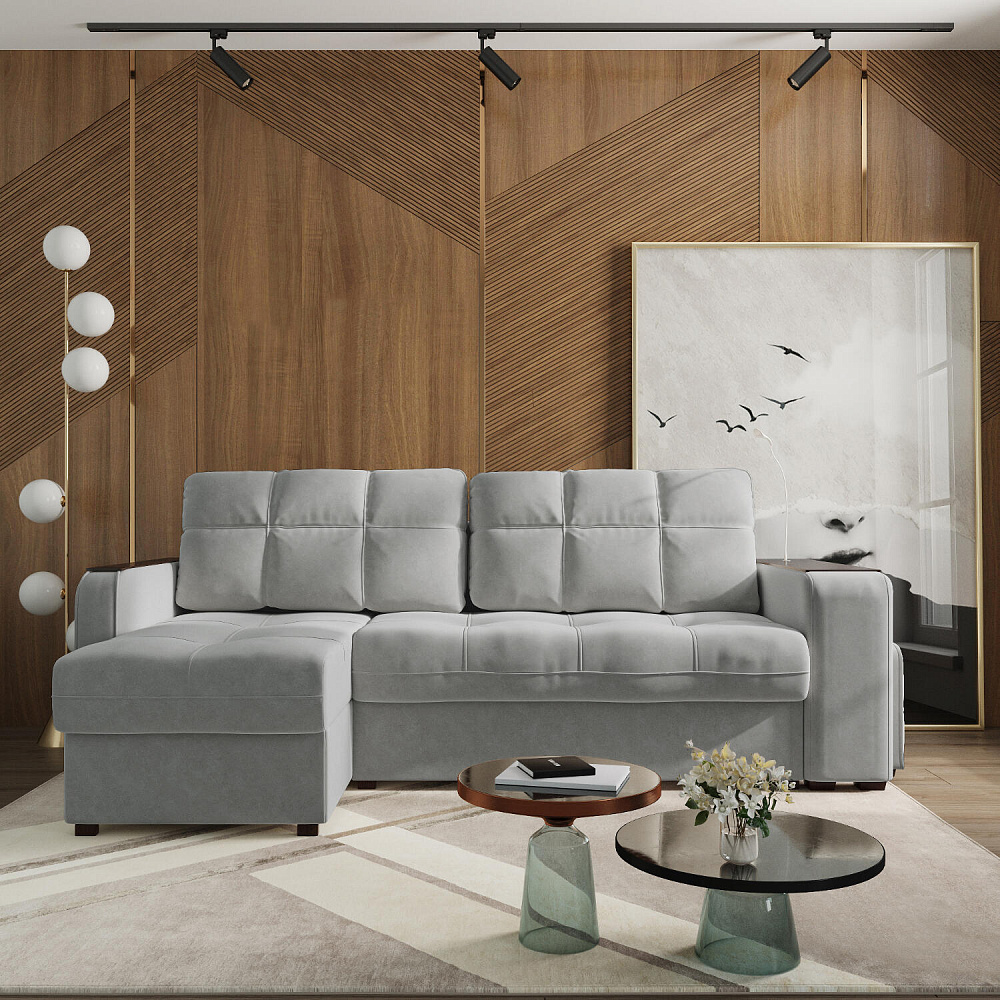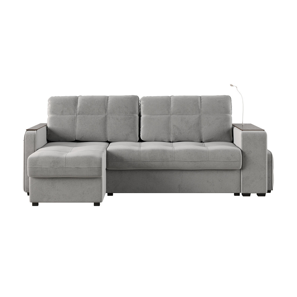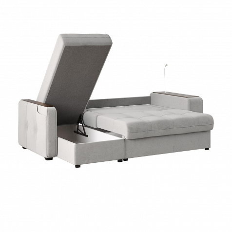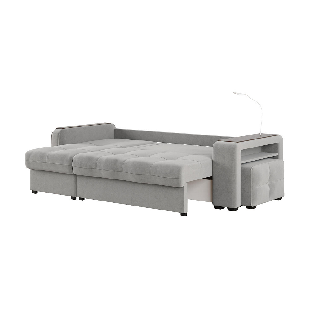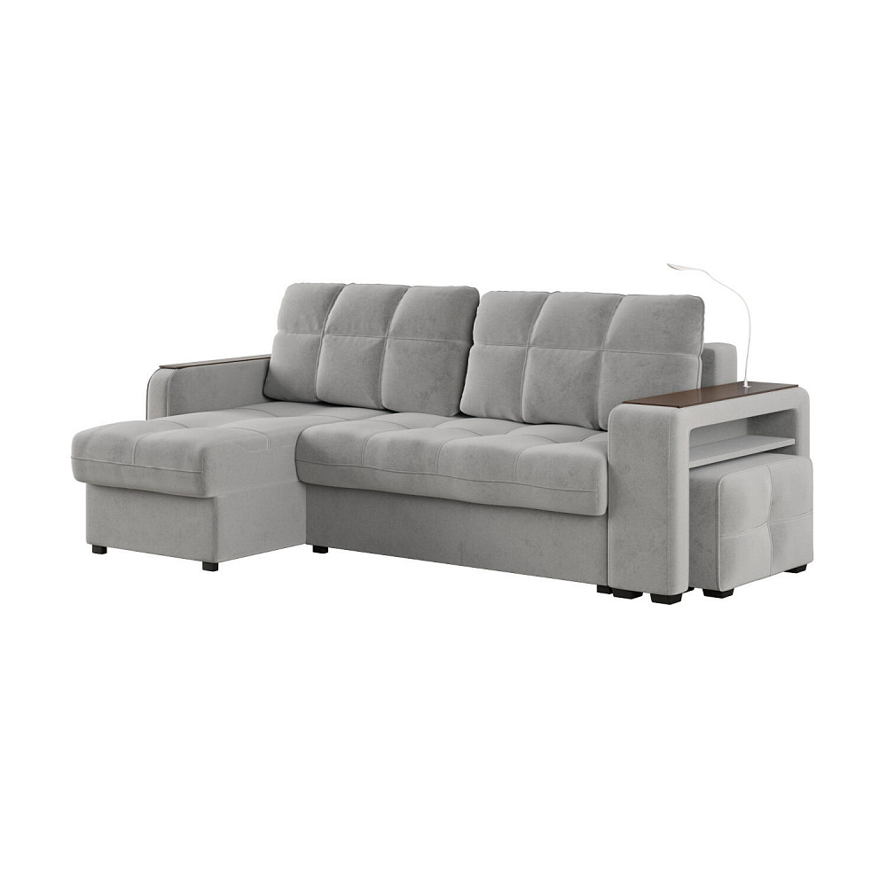 Угловой диван «Киль» подойдёт тем, кто ищет многофункциональную модель для отдыха и работы. Модель со спальным местом отличается технологичными подлокотниками, портативной лампой в комплекте, двумя ящиками для белья и встроенным пуфиком. Вдобавок к большому функционалу диван не перегружен декором, поэтому прекрасно подойдёт к большинству современных интерьеров.