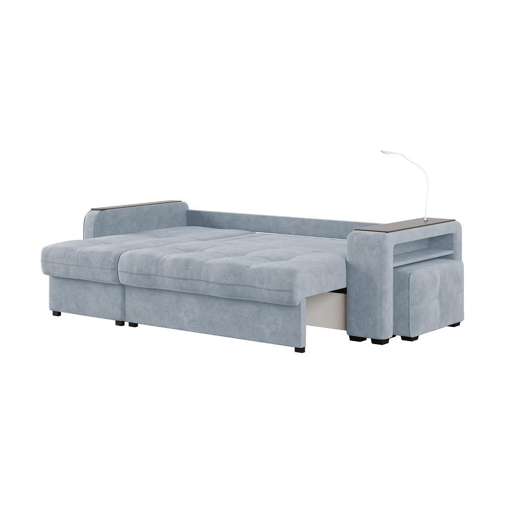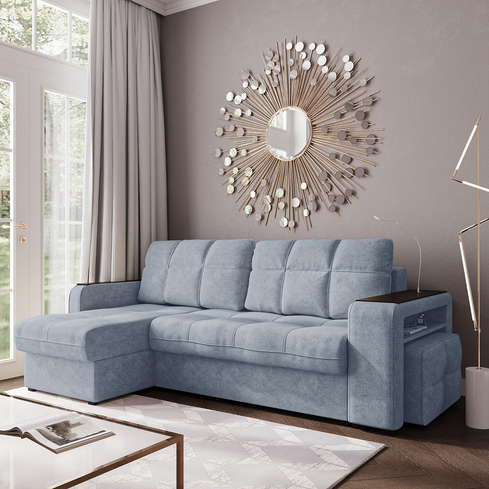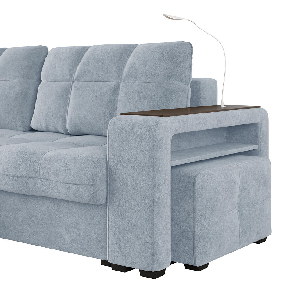 Угловой диван «Киль» подойдёт тем, кто ищет многофункциональную модель для отдыха и работы. Модель со спальным местом отличается технологичными подлокотниками, портативной лампой в комплекте, двумя ящиками для белья и встроенным пуфиком. Вдобавок к большому функционалу диван не перегружен декором, поэтому прекрасно подойдёт к большинству современных интерьеров.
